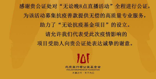日前,北京益行者公益基金会给北京市长安公证处送来一封感谢信,感谢公证员刘智等人连续14天对“无讼晚8点直播活动”全程进行公证,为活动募集抗疫善款提供无偿公证法律服务,确保了整个课程直播运营、课酬收取、捐赠及财务公示等过程的公开透明。