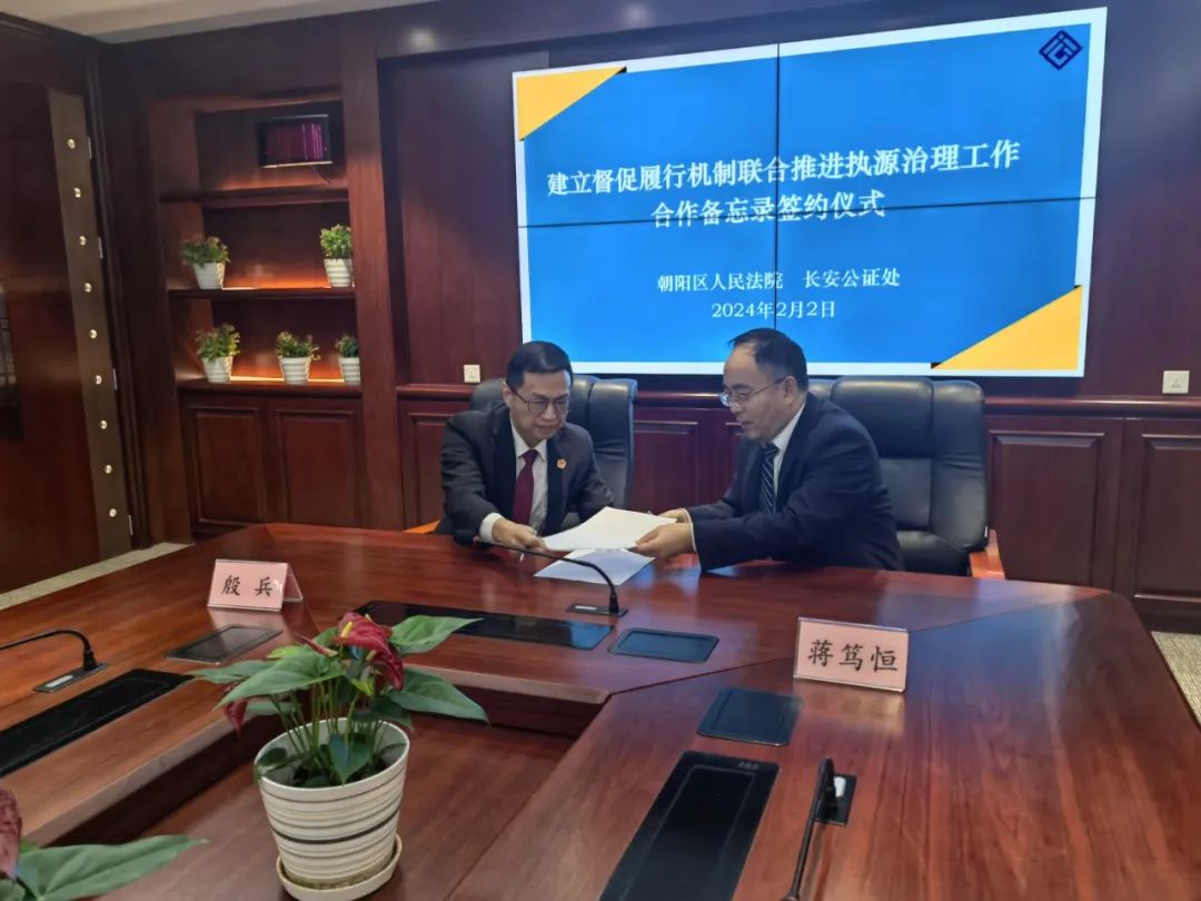 为深入贯彻落实最高人民法院关于以能动司法主动融入国家治理、社会治理,从源头上解决执行难,高效兑现胜诉当事人合法权益的重要部署,2024年2月2日,北京市长安公证处与北京市朝阳区人民法院签署《关于建立督促履行机制联合推进执源治理工作合作备忘录》。