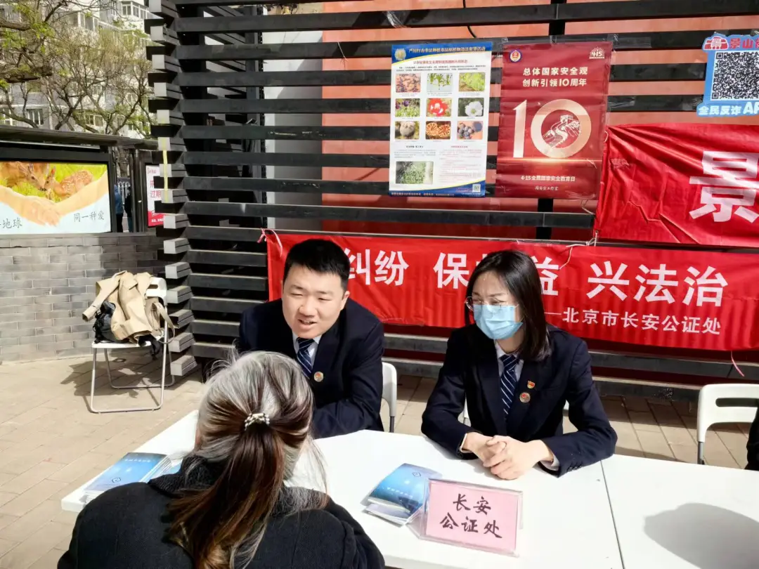 在总体国家安全观提出十周年之际,2024年4月15日,北京市长安公证处与景山街道司法所、街道团工委联合总工会、妇联等群团组织、便民服务单位,在景山市民文化中心广场开展“景山街道4·15国家安全教育日”大型普法宣传活动。