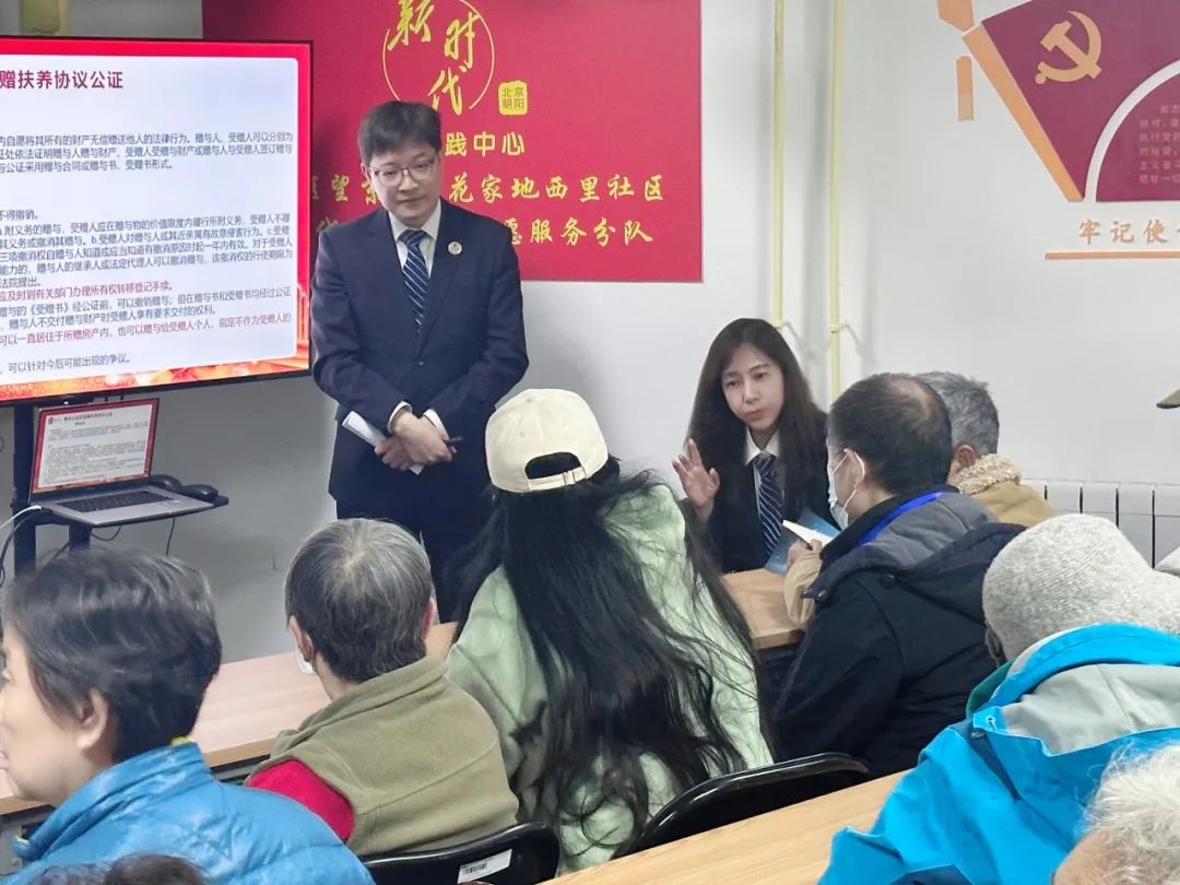 2024年11月20日,长安公证处助残小组成员公证员郭岳萍、陈豪彬来到朝阳区花家地西里社区文明市民学校,为该地区残疾人及其家属开展“法律护航 助残前行”主题普法讲座。公证人员就与残疾人生活密切相关的民事、家事类公证业务进行了专门讲解,并现场发放了宣传资料50余份。