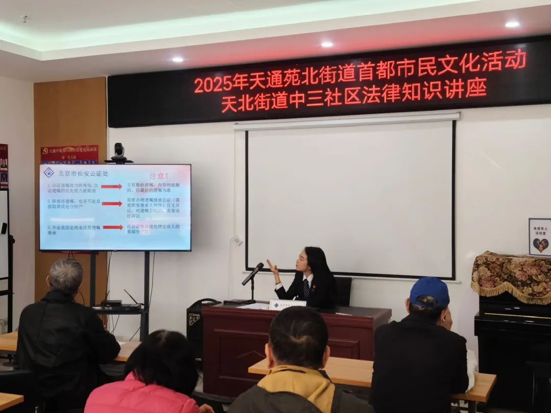 3月19日,为进一步推进公证法律服务进社区工作,提升社区居民幸福感和获得感,北京市长安公证处回天分部公证员张雨嫣、公证员助理单良、杨泽伟一行三人来到天通中苑第三社区居民委员会,参与由昌平区天通苑北街道举办的2025年首都市民文化活动,开展法律知识讲座。