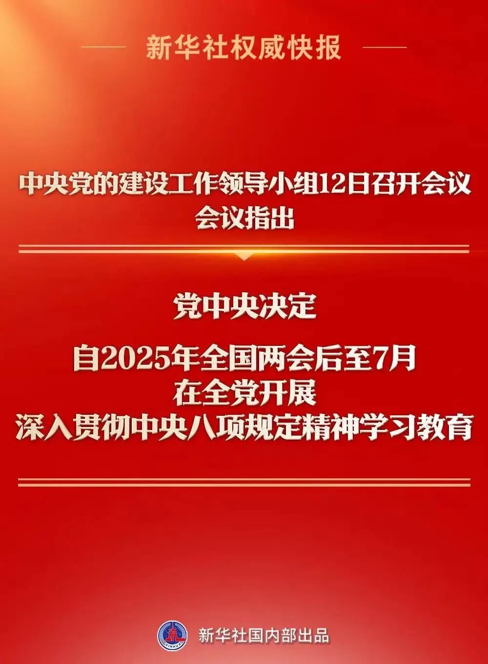 会议指出,党中央决定,自2025年全国两会后至7月在全党开展深入贯彻中央八项规定精神学习教育。习近平总书记高度重视,亲自谋划确定学习教育主题,发表重要讲话,作出重要指示,为开展学习教育指明了方向。近日,中共中央办公厅印发《关于在全党开展深入贯彻中央八项规定精神学习教育的通知》。要深入学习贯彻习近平总书记的重要讲话和重要指示精神,落实《通知》要求,深刻领悟“两个确立”的决定性意义,坚决做到“两个维护”,切实把思想和行动统一到党中央决策部署上来。