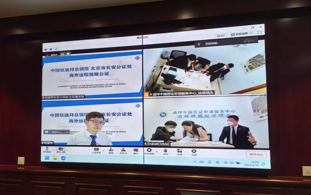 2022年6月15日,北京市长安公证处与中国驻迪拜总领事馆、迪拜中国签证申请服务中心通过远程视频方式,为居住于迪拜的中国公民赵女士办理了用于财产继承的委托书公证。这是长安公证处与中国驻迪拜总领事馆首例合作办理的远程视频公证。